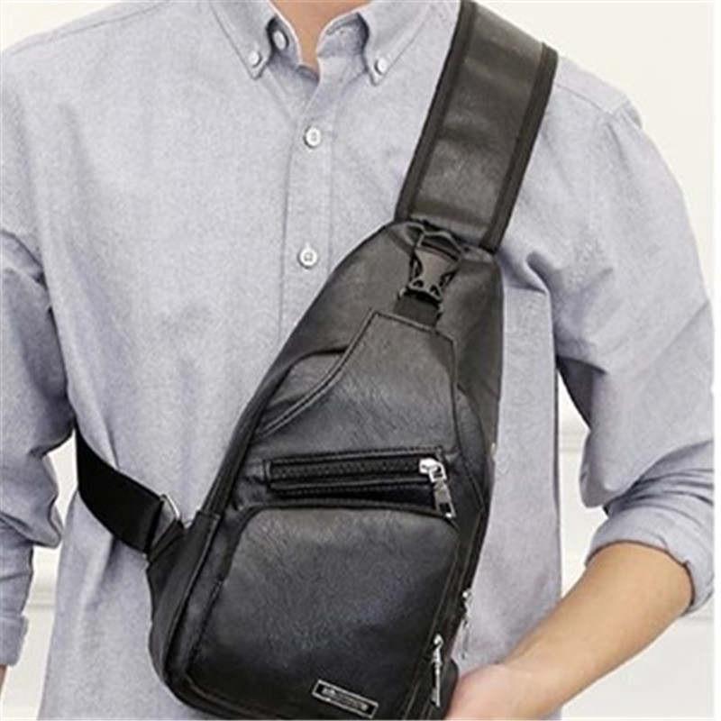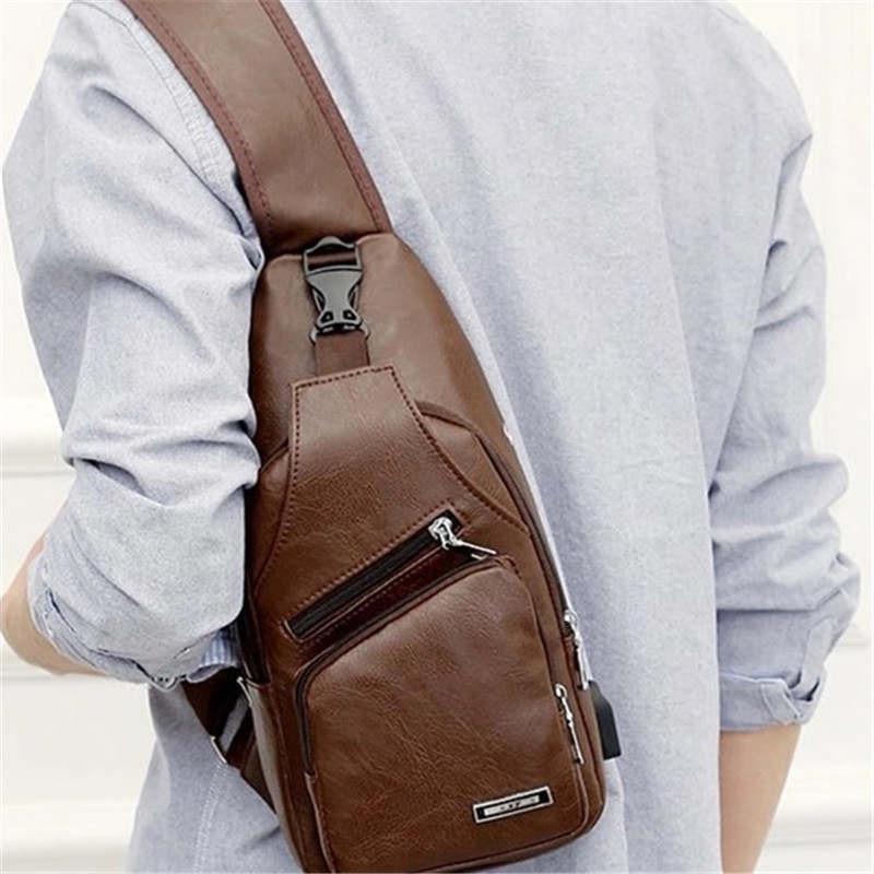 Material: PU leather Size:16x33x8cm (Conversion: 1cm=0.3937 inch, linch=2.54 cm) Color:light brown,black,Dark brown It's perfect for walking/traveling/biking/hiking and everyday using The chest bag equipped with earphone hole and USB charging port which is very convenient. There is no power supply for the USB port Perfectly works as sling shoulder pack, wear this sling bag over either shoulder